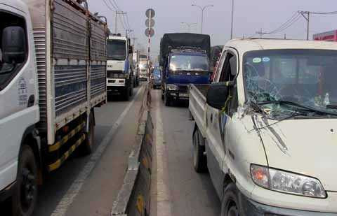 Chiếc xe tải thứ 4 mang BKS 51C – 664.03 phía sau tiếp tục lao lên, đẩy hàng xe phía trước dính vào nhau.