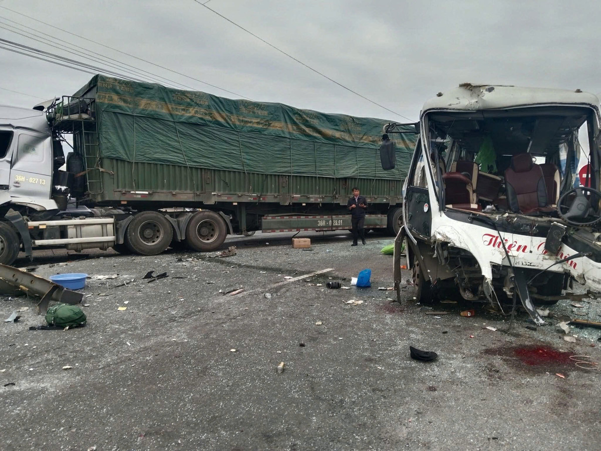 Sau khi va chạm, xe khách lao qua làn đường hướng Bắc - Nam bị xe container BKS 36H-027.13 tông vào.
