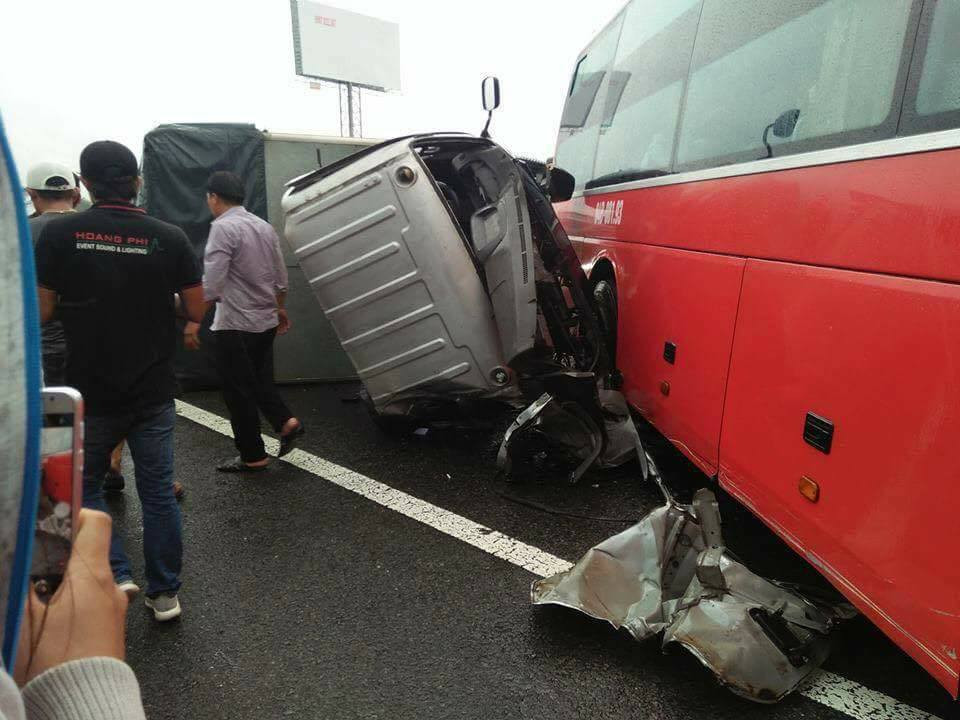 Đúng lúc này, 2 ô tô khác từ phía sau chạy tới không kịp xử lý nên tông liên tiếp với 2 xe gặp nạn.