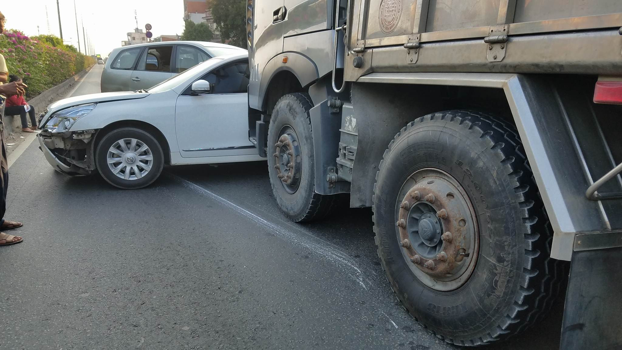 Lúc này, một ô tô 4 chỗ chạy từ làn xe máy ra làn ô tô với tốc độ nhanh, tài xế Ngọc phải thắng gấp nhưng không kịp do khoảng cách quá gần. Xe tải tông mạnh vào đuôi ô tô 4 chỗ, đẩy xe này lao về phía trước rồi tiếp tục va vào đuôi một ô tô 7 chỗ khác.