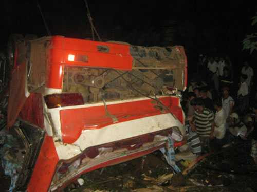 | Chiếc xe khách bẹp dúm sau vụ tai nạn |