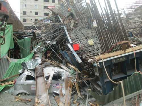 Một khối lượng sắt thép và bê tông khổng lồ đã đè bẹp một chiếc taxi. Rất may mắn, sự cố không gây ra thương tích về người.