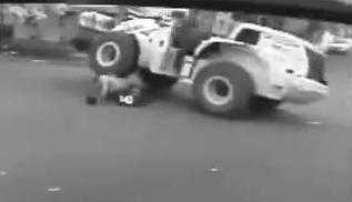 Chiếc xe scotter máy lao thẳng vào chiếc máy xúc khi đang đi qua ngã tư, sau đó cả hai bánh xe đi qua người phụ nữ.