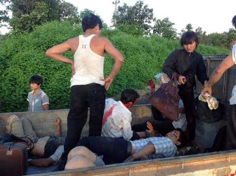 | Nhiều người đi trên ôtô bị thương, được người dân dùng xe tải đưa đi cấp cứu |