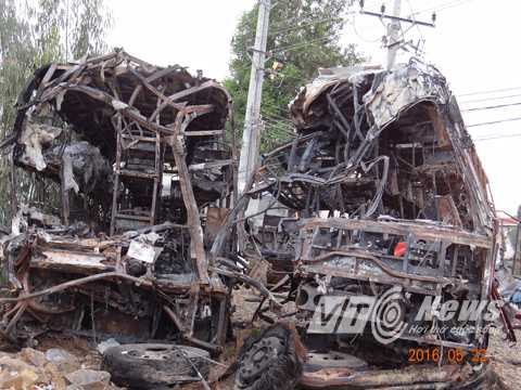 | Hai xe khách bị cháy rụi hoàn toàn. Ảnh: Phan Cường |