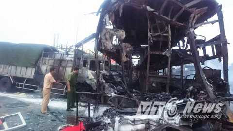 (VTC News) - Lực lượng điều tra nhận định, hai xe khách đối đầu nhau với lực va chạm rất mạnh, tuy nhiên vì sao xe bốc cháy dữ dội vẫn đang được làm rõ.