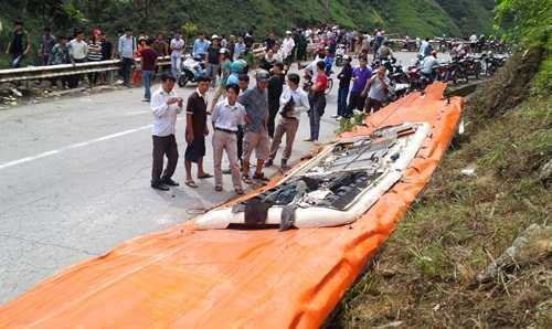 Tại hiện trường, chiếc xe bị nát vụn, các mảnh vỡ văng tứ tung trong bán kính hàng chục mét. Lực lượng cứu hộ phải dùng nhiều biện pháp để đưa các mảnh vở của chiếc xe khách lên phục vụ công tác điều tra. Dây cáp được hạ xuống hàng trăm mét để đến được hiện trường chiếc xe đang nằm.