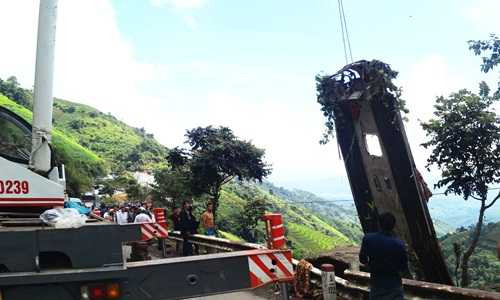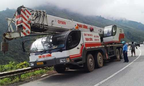 | Chiếc xe cẩu được điều động đến hiện trường để cẩu xe khách gặp nạn lên từ vực sâu |