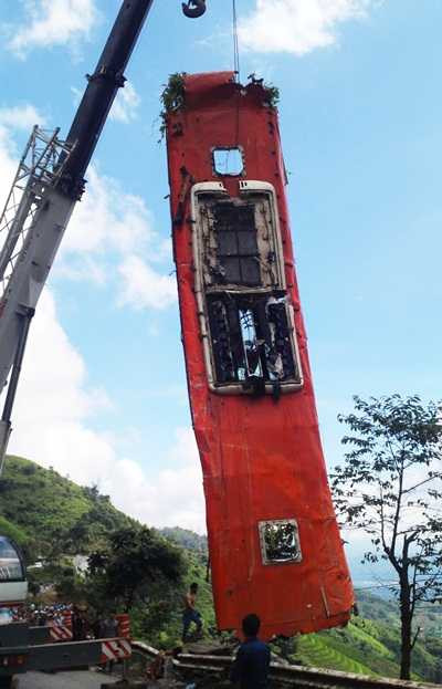 | Phần nóc của chiếc xe khách được đưa lên khỏi vực sâu |
