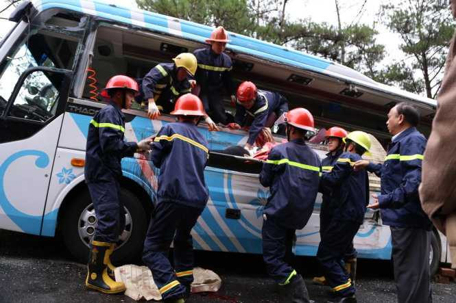 ![]() Đội cứu hộ đưa các nạn nhân ra khỏi xe khách Thanh Lịch - Ảnh: C.THÀNH |