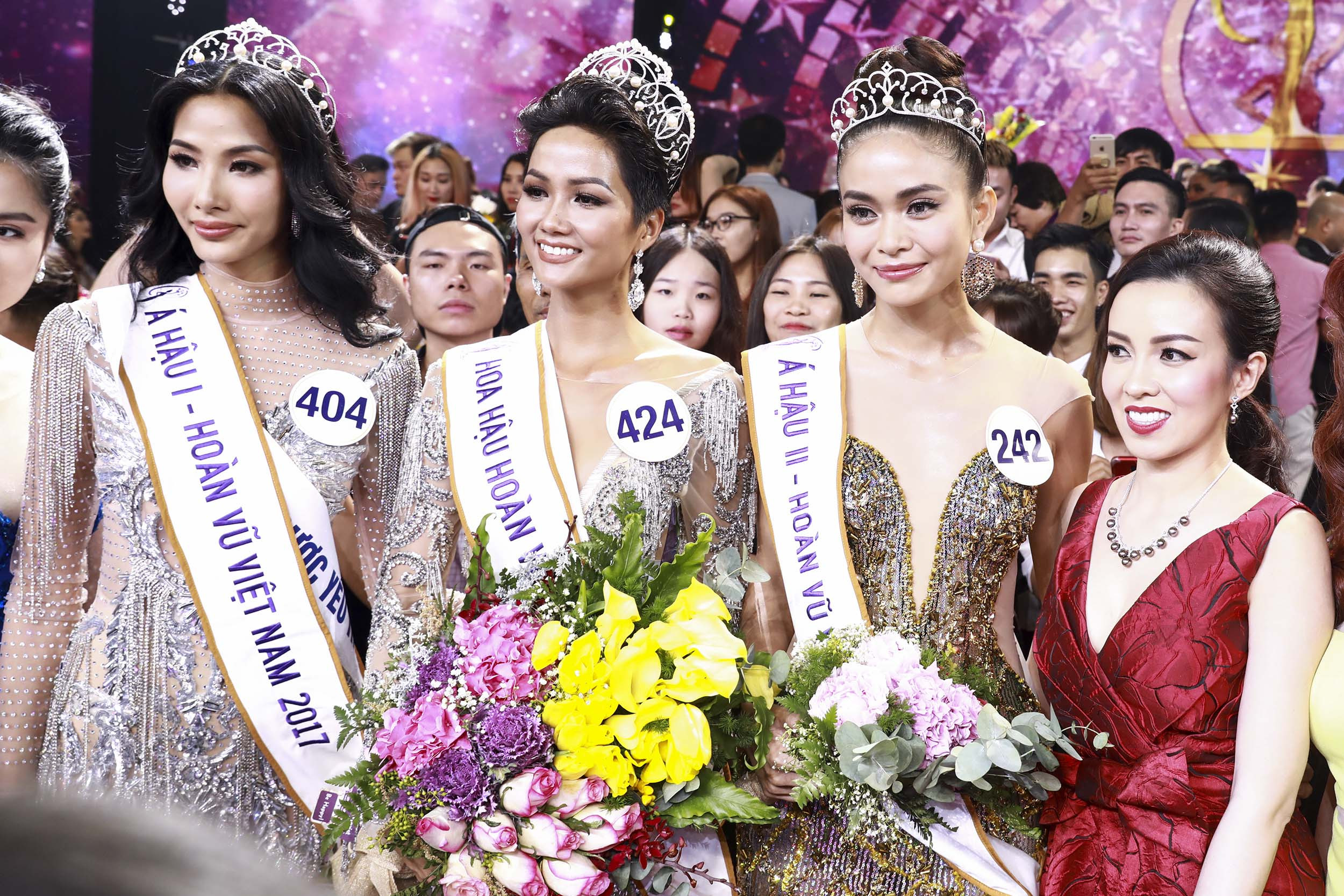 Ngoài ra, Hoàng Thùy và Mâu Thủy cũng lần lượt đăng quang ngôi Á hậu 1 và Á hậu 2. Hai người đẹp có những phút giây đáng nhớ khi được xướng tên ở hai ngôi Á hậu.