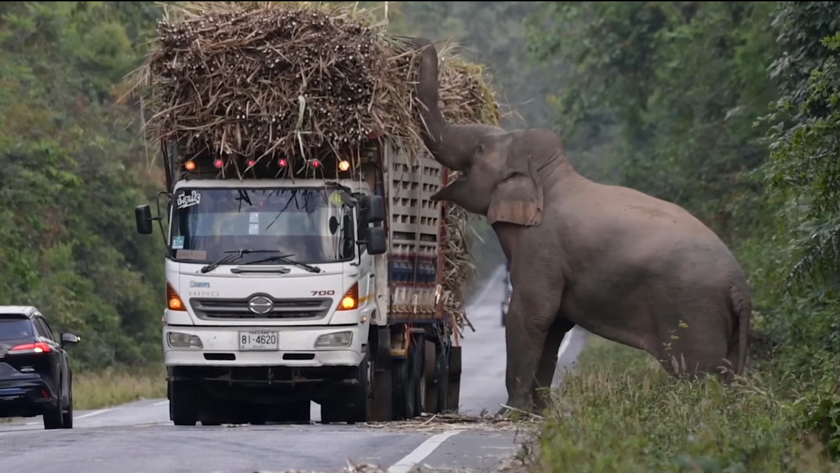 Tài xế bất lực nhìn voi rừng chặn xe tải cướp mía ở Thái Lan