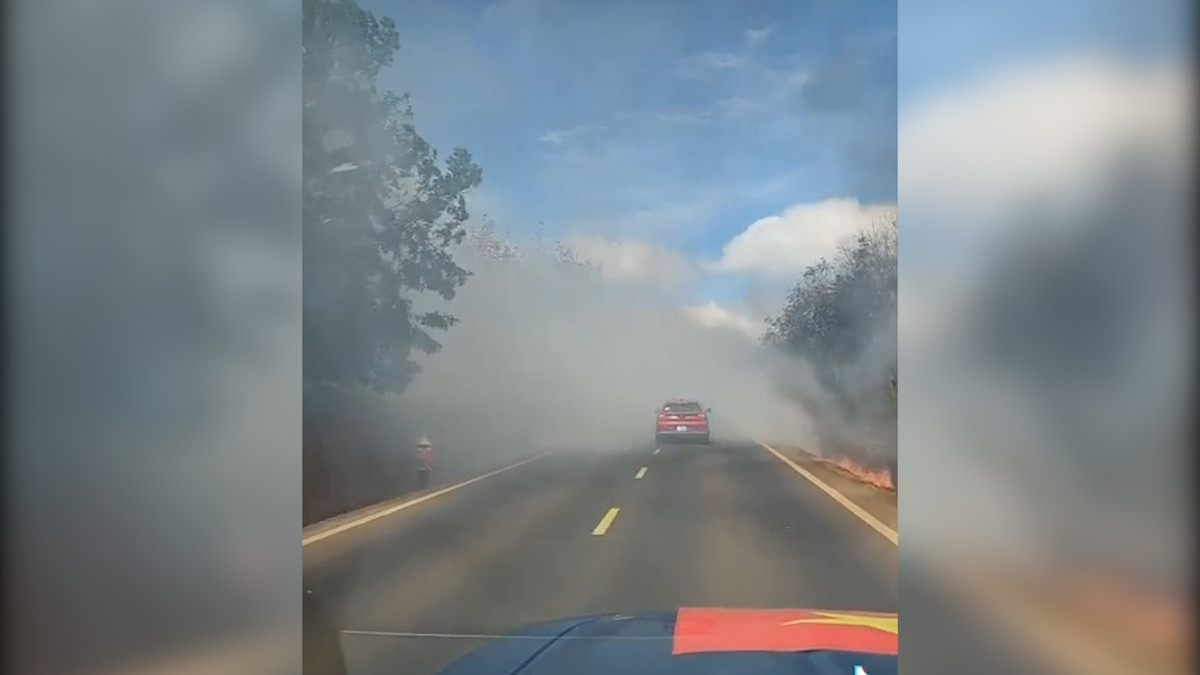Công nhân dọn vệ sinh đốt lá, khói bay mù mịt bao phủ đoạn đường tránh thị xã Buôn Hồ, tỉnh Đắk Lắk khiến các phương tiện lưu thông qua đây gặp nhiều nguy hiểm.
