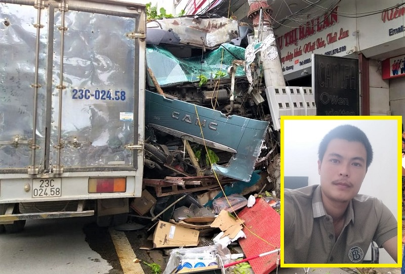 Lúc này, nam tài xế bị bật từ ghế lái sang ghế phụ, đập mặt vào taplo, khiến phương tiện lao lên vỉa hè tông trúng 13 chiếc xe máy cùng một số vật dụng, hàng hóa của người dân, may mắn không gây thương vong về người. Xe container chỉ dừng lại khi tông trúng cột điện ven đường. Số tiền thiệt hại ước tính khoảng hơn 1 tỷ đồng.