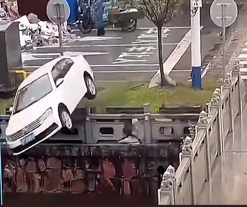 Video ghi lại cảnh chiếc ô tô mất kiểm soát đâm đổ rào chắn rồi lao xuống sông tại TP Nam Thông, tỉnh Giang Tô, Trung Quốc.