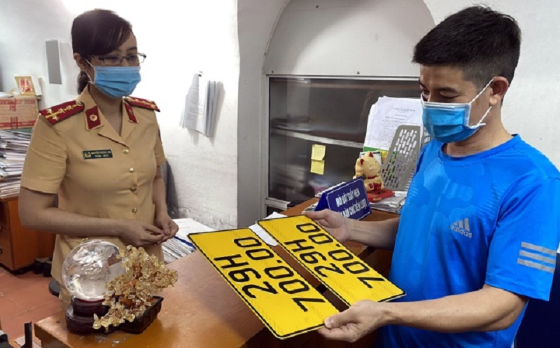 Tài xế đeo khẩu trang, ngồi giãn cách khi đi đổi màu biển số