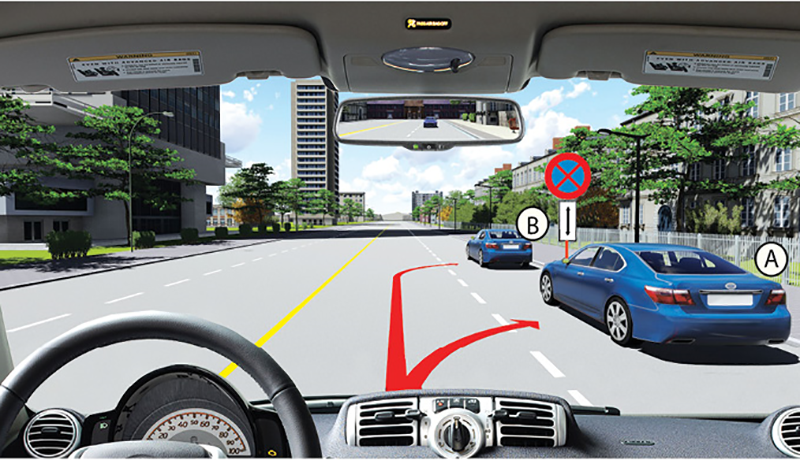 Giữa điểm A và B có đặt biển báo cấm dừng xe và đỗ xe (ký hiệu là P.130) có hiệu lực với tất cả các phương tiện xe cơ giới dừng và đỗ xe tại điểm có đặt biển báo, trừ các phương tiện được ưu tiên như: xe cứu hỏa, xe cứu thương… làm nhiệm vụ.