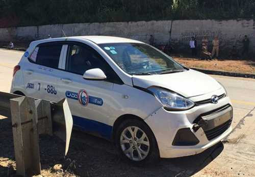 | Chiếc xe taxi mang biển số tỉnh Lâm Đồng bị cướp, được giữ lại tại Trạm CSGT Ngọc Hồi - Ảnh: Thái Bá Dũng |