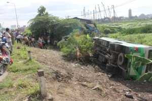 Lúc này, phụ xe ngay lập tức hô hoán, thông báo cho những phương tiện phía sau biết để phòng tránh. Người đi đường sợ hãi khi nhìn thấy chiếc xe lao thẳng xuống vệ đường rồi lật nhào.