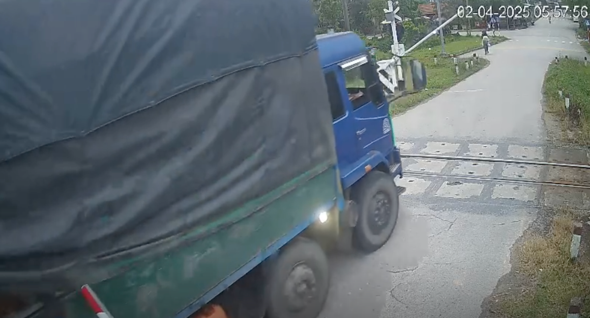 Cảnh xe tải tông gãy gác chắn, vượt qua đường sắt khi tàu hỏa đang lao tới. (Ảnh cắt từ clip)