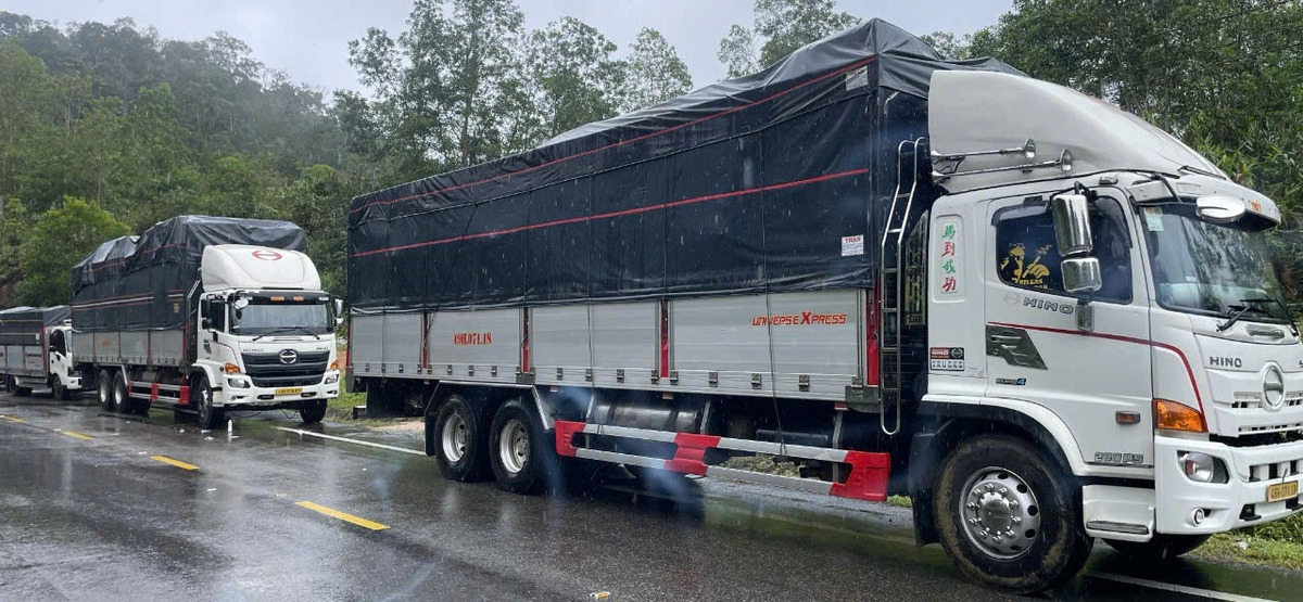Hai xe tải chở hoa của nhà xe Thanh Thủy bị kẹt trên đèo Khánh Lê do sạt lở suốt 2 ngày qua.
