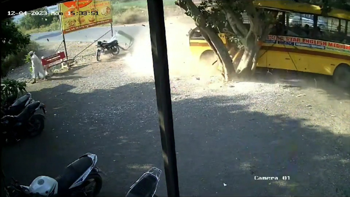 3 người bị thương sau khi tài xế mất kiểm soát khiến xe buýt chở học sinh tông mạnh vào cây bên đường tại khu vực wagholi, Pune, Ấn Độ.