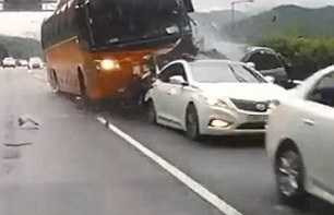 Tài xế xe buýt ngủ gật khiến chiếc xe mất lái, tông nát một loạt xe con phía trước; vụ tai nạn khủng khiếp xảy ra tại Hàn Quốc khiến 4 người chết và 37 người bị thương.