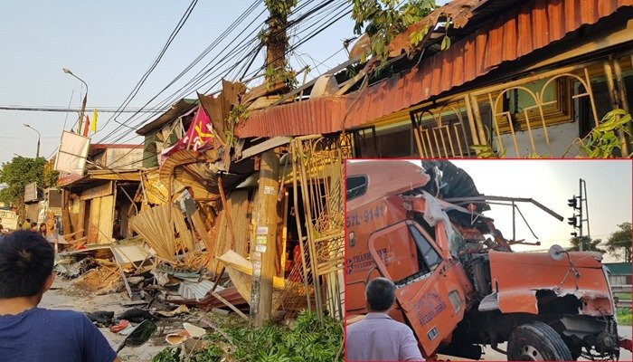 Hàng loạt ngôi nhà ven đường bị container tông sập.