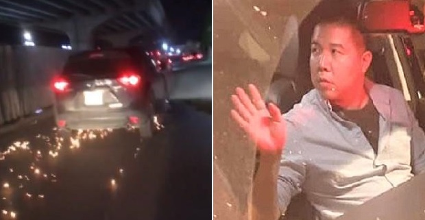 Lúc này, tài xế không dừng lại mà còn tiếp tục phóng xe bỏ chạy, kéo theo chiếc xe đạp điện mắc kẹt dưới gầm tạo thành vệt lửa dài trên đường.
