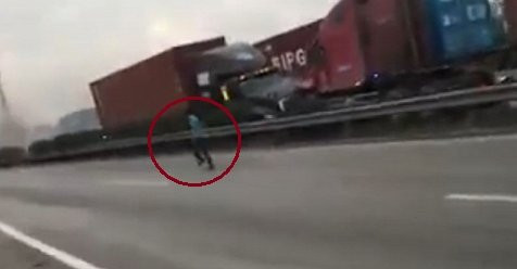 Tài xế hốt hoảng chạy khỏi buồng lái trước khi 2 xe container đối đầu. (Ảnh cắt từ clip).