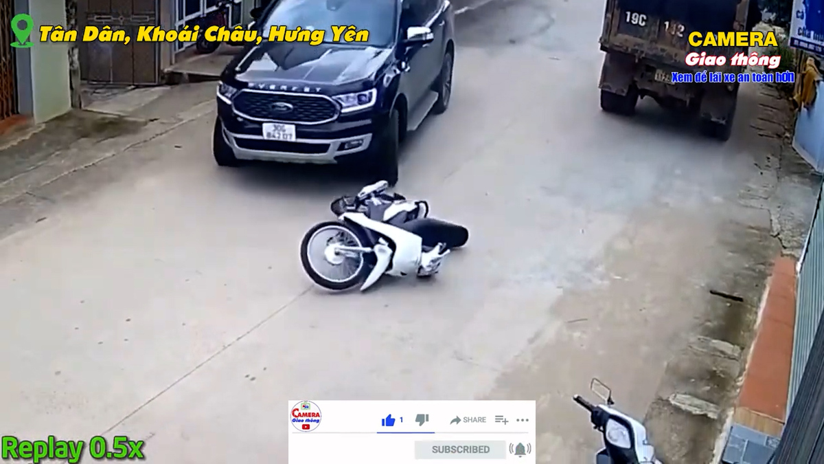 Tài xế xe 7 chỗ đánh lái tránh xe tải chạy ngược chiều khiến ô tô loạng choạng rồi tông và kéo lê xe máy trên đường tại Khoái Châu, Hưng Yên.