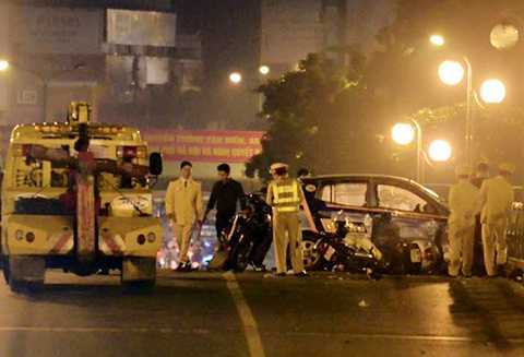Khoảng 22h40 ngày 8/11 tại khu vực cầu vượt Chùa Bộc - Thái Hà (Đống Đa, Hà Nội), xe taxi mang BKS 30A - 646.73 của hãng Vinataxi di chuyển theo hướng Ngã Tư Sở - Nguyễn Lương Bằng bất ngờ lao sang phần đường đối diện đâm vào hàng chục xe máy đang lưu thông theo chiều ngược lại.