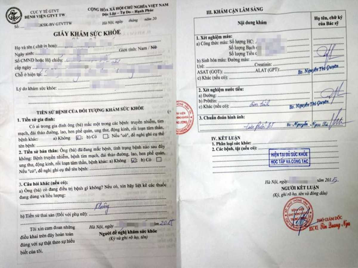 Với sự chuẩn bị từ trước, Cường tự điền các thông tin trong giấy khám sức khỏe giả và tự ký xác nhận tên đóng dấu chức danh bác sỹ khám, ký xác nhận tên bác sỹ trưởng đoàn khám, và đóng dấu tròn của bệnh viện GTVT.
