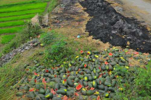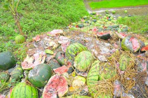 | Sau nhiều ngày bị ùn ứ, dưa của người dân bắt đầu thối rữa. (Ảnh: Lao Động) |