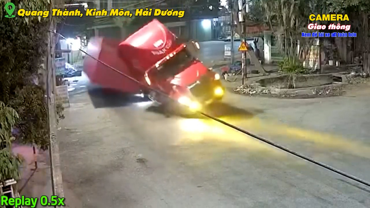 Tài xế điều khiển xe container vào cua với tốc độ cao, không kiểm soát được tình hình khiến xe lật ngang ra giữa đường tại Kinh Môn, Hải Dương.