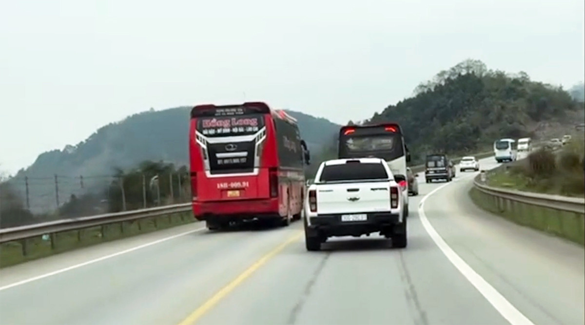 Tài xế xe khách vượt ẩu trên cao tốc Nội Bài - Lào Cai. (Ảnh cắt từ clip)