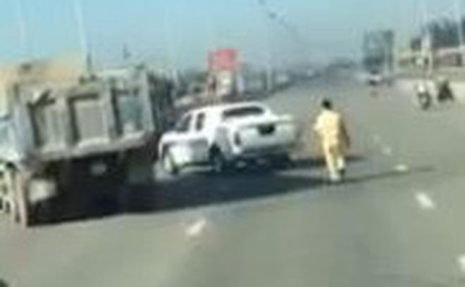 Xe ben húc vào CSGT rồi tháo chạy. (Ảnh: Cắt từ clip)