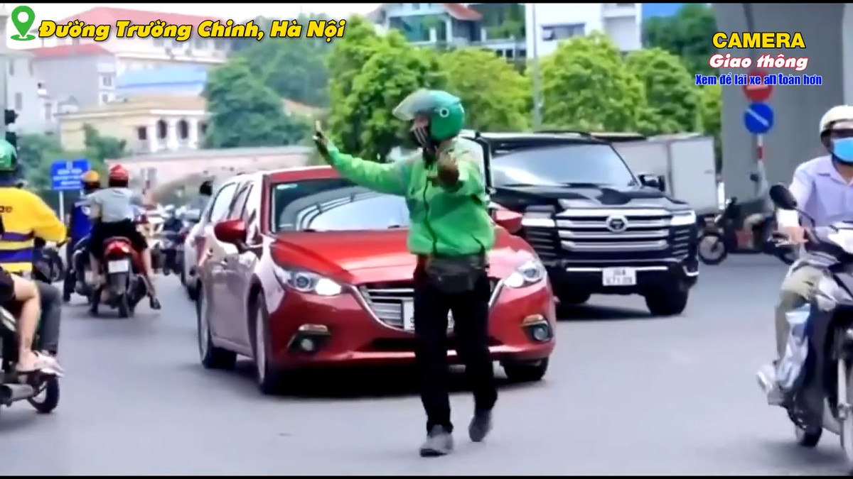 Tại đường Trường Chinh, Hà Nội, nhận thấy ùn tắc nam thanh niên chạy xe ôm công nghệ dừng xe, điều tiết, phân luồng giao thông giảm ùn ứ giờ cao điểm.