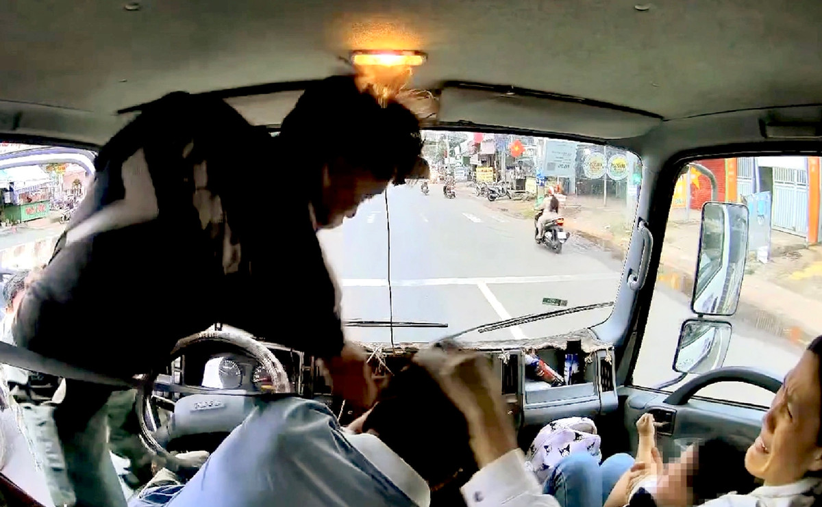 Tối 15/12, một đoạn clip dài khoảng 4 phút ghi lại cảnh nam tài xế xe tải bị một người đàn ông liên tục đá, đấm vào đầu, người trong khoang lái. Ngồi bên ghế phụ còn có một người phụ nữ bồng con nhỏ.