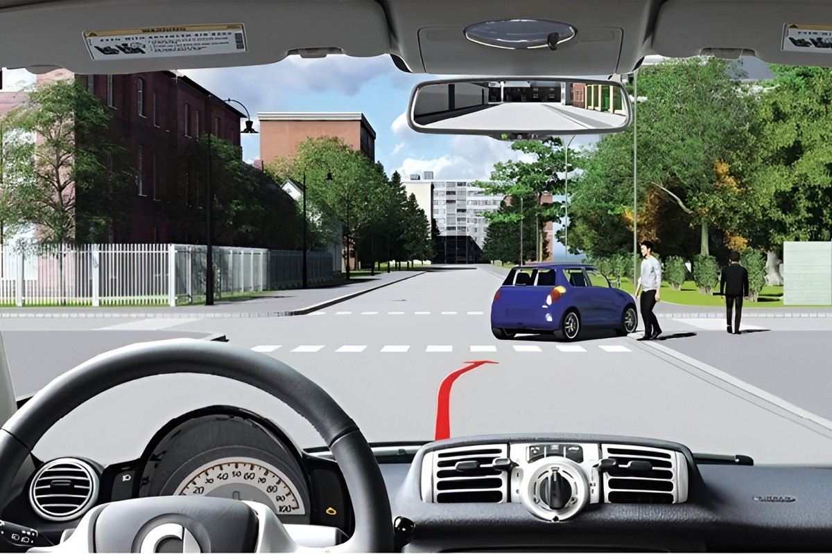 Giảm tốc độ, để người đi bộ qua đường và rẽ phải trước ô tô màu xanh.