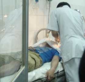 | Anh Huỳnh Khánh Thông cấp cứu tại BV Quốc Ánh với 6 vết khâu trên đầu, cơ thể xây xát. Ảnh: Trương Như Mai |
