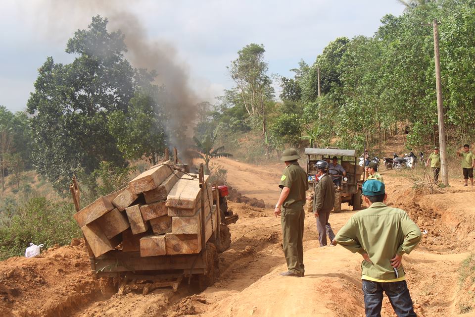 Nhận được tin báo, Công an huyện M’Đrắk phối hợp với Hạt Kiểm lâm huyện mật phục, bắt giữ 5 xe công nông chở 10 - 15 hộp gỗ được cưa xẻ vuông vắn, chiều dài khoảng 3m từ cửa rừng ra.