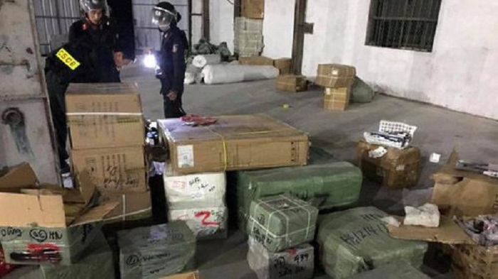 Cảnh sát kiểm tra kho hàng của đường dây buôn lậu do Đào Văn Chấp cầm đầu. (Ảnh: Tiền Phong)