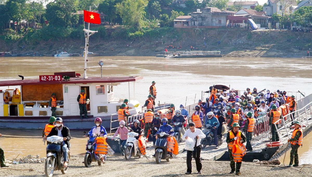 Từ trưa 10/6 tạm dừng hoạt động lưu thông qua phà để chuẩn bị lắp lại cầu phao Phong Châu. (Ảnh: Cổng thông tin điện tử tỉnh Phú Thọ)