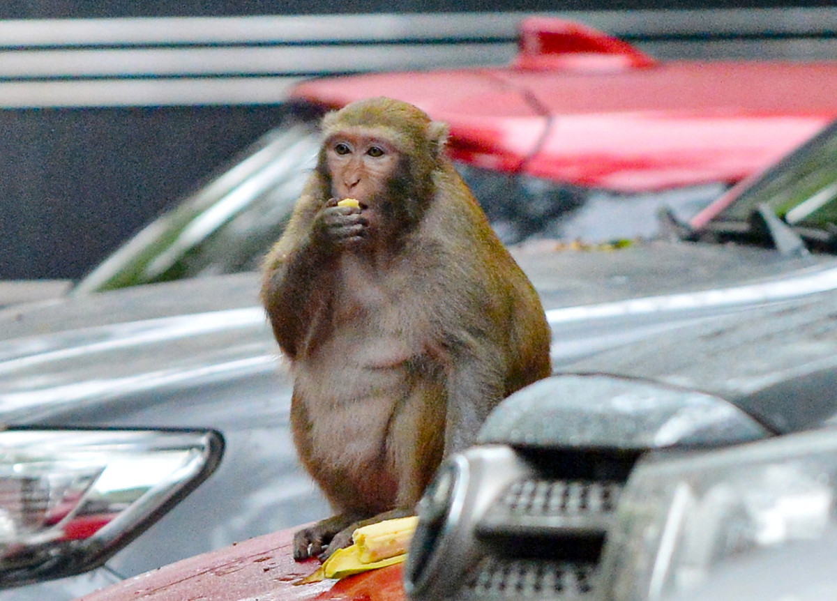 Khi đói, con khỉ này sẽ xuống bãi trông xe kiếm ăn, sau đó di chuyển lên những cành cây cao.