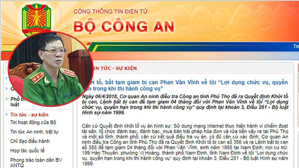Ngày 6/4, Bộ Công an thông tin về việc Cơ quan An ninh điều tra Công an tỉnh Phú Thọ vừa ra quyết định khởi tố bị can, lệnh bắt bị can để tạm giam 4 tháng đối với Phan Văn Vĩnh (SN 1955, trú tại số 199 Hàn Thuyên, phường Vị Hoàng, thành phố Nam Định, tỉnh Nam Định) về tội “Lợi dụng chức vụ, quyền hạn trong khi thi hành công vụ” quy định tại khoản 3, Điều 281 Bộ luật Hình sự năm 1999.