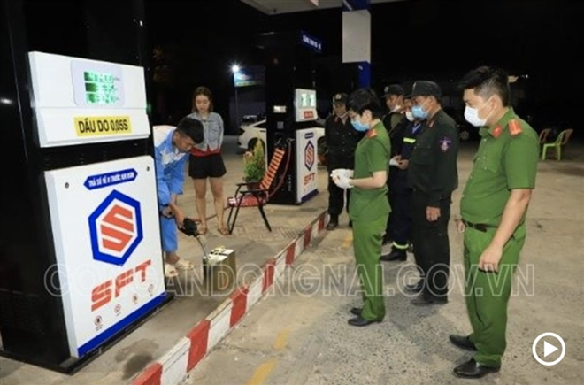 Lực lượng chức năng kiểm tra cây xăng trong đường dây xăng giả. (Ảnh: Công an Đồng Nai)