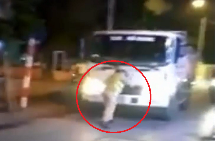 Ngay sau đó, chiến sĩ CSGT nhanh chóng nhảy sang một bên để tránh chiếc xe tải, còn tài xế xe tải phóng xe đi.