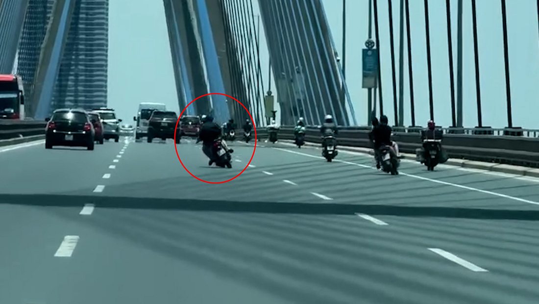 Hai xe máy liên tục đánh võng trên cầu Nhật Tân. (Ảnh chụp màn hình)