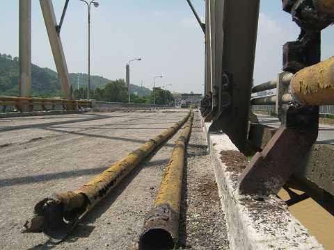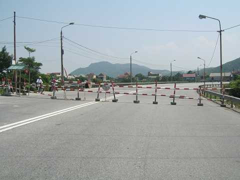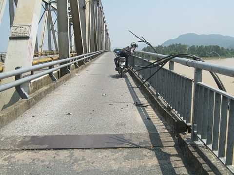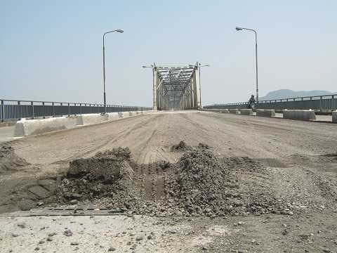 | Đầu cầu phía Bắc, mặt đường được bóc lên để phủ lớp nhựa mới |